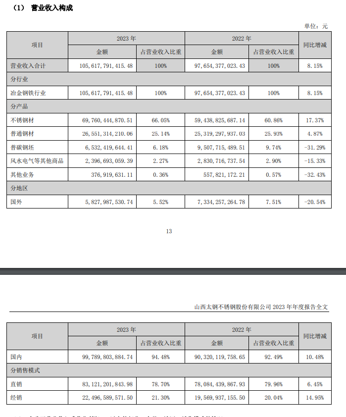 4月26日,太鋼不銹(000825)發(fā)布2023年年度報(bào)告,2023年實(shí)現(xiàn)營(yíng)業(yè)收入1056.18億元,同比增長(zhǎng)8.15%;實(shí)現(xiàn)凈利潤(rùn)-10.81億元;基本每股收益-0.190元;加權(quán)平均凈資產(chǎn)收益率ROE為-3.16%;經(jīng)營(yíng)活動(dòng)產(chǎn)生的現(xiàn)金流量?jī)纛~為26.66億元,同比下降47.83%;投資活動(dòng)產(chǎn)生的現(xiàn)金流量?jī)纛~為-20.07億元;籌資活動(dòng)產(chǎn)生的現(xiàn)金流量?jī)纛~為-33億元。