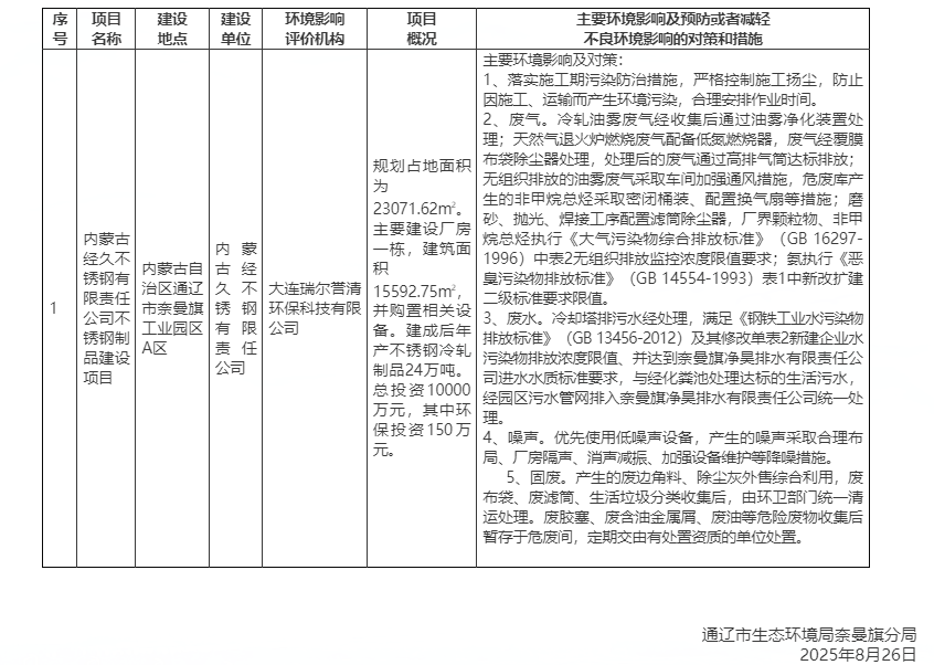 8月26日,通遼市生態(tài)環(huán)境局奈曼旗分局發(fā)布了《關(guān)于內(nèi)蒙古經(jīng)久不銹鋼有限責(zé)任公司不銹鋼制品建設(shè)項目(報告表)擬審批公示》。